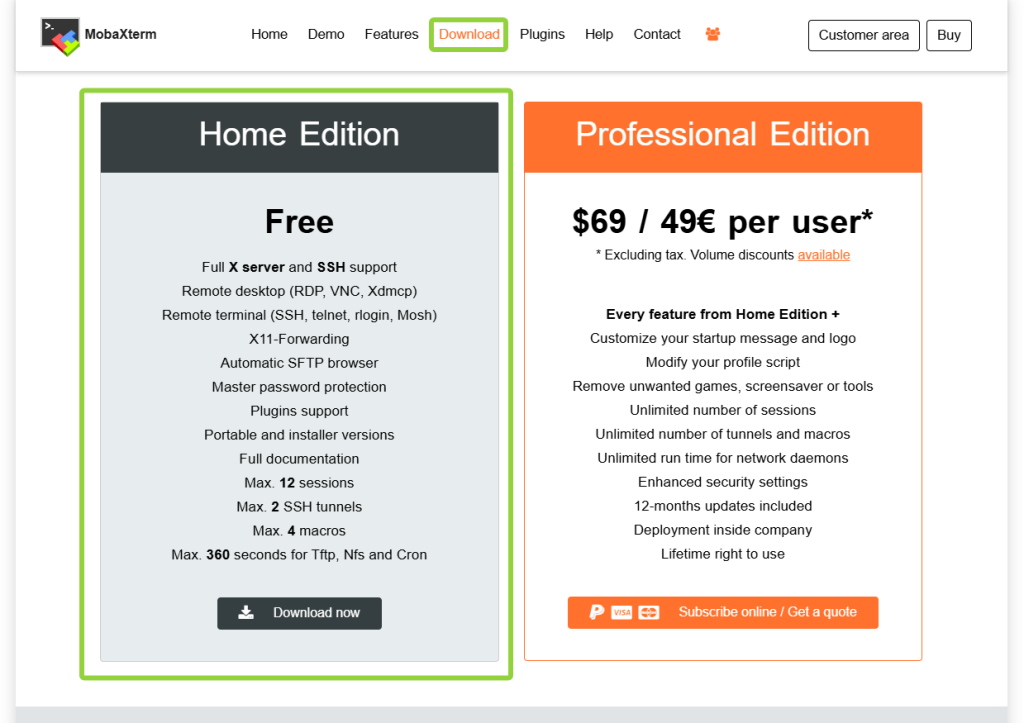 下载mobaxterm,官网参考链接:MobaXterm free Xserver and tabbed SSH client for Windows。点击上方导航栏Download,选择免费版本的Home Edition即可开始下载,视个人选择免安装版本还是安装版本。